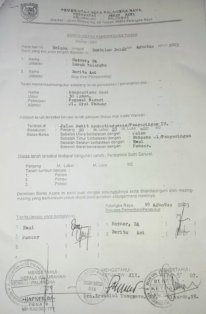 Pada hari yang sama Ketika Media ini mengkonfirmasi kepada Berita Asi, S.Sos yang sekarang menjabat Lurah Petuk Ketimpun di ruang Kerjanya mengatakan, untuk sementara ia mengakui menanda Tangani Surat Berita Acara Pemeriksaan Tanah karena waktu itu saya sebagai Staf Pegawai Kelurahan, Kecamatan Jekan Raya. Namun saya Lupa? pada tahun 2003 yang lalu, apa saya yang buat, atau yang bersangkutan Pemilikan An. Anograriane Desi yang membuat Surat pernyataan Tanah itu, karena waktu itu sebelum saya tanda Tangan di dalam Berita Acara Surat Keterangan Tanah sudah ada dulu tanda Tangan Bapak lurah Hapner, BA [Pensiun], setelah itu Baru saya tanda Tangan Karena di dalam Surat tanah tersebut kami sebagai Petugas Pemeriksa / Pengukur, ada Tanda Tangan Ketua Rw. XIX An. Erensiul Tengara, S.H serta ada Tanda Tangan Ketua Rt.O7 An. Minardo, SE di Surat tersebut, Ucapnya.